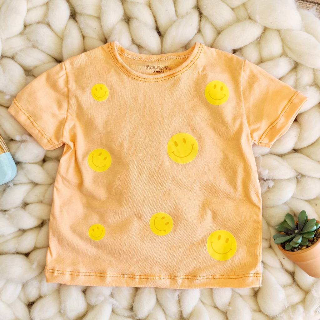 Remera de jersey naranja con estampa dtf termoadhesiva carita feliz.